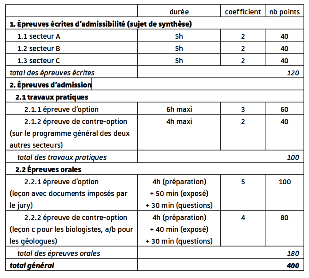 - les épreuves d’admission, constituées de travaux pratiques et d’oraux. Pour les épreuves d’admission, le candidat choisit un des trois secteurs (A, B ou C) comme étant son secteur d’option. Les épreuves dans le secteur d’option choisi auront des coefficients plus élevés.